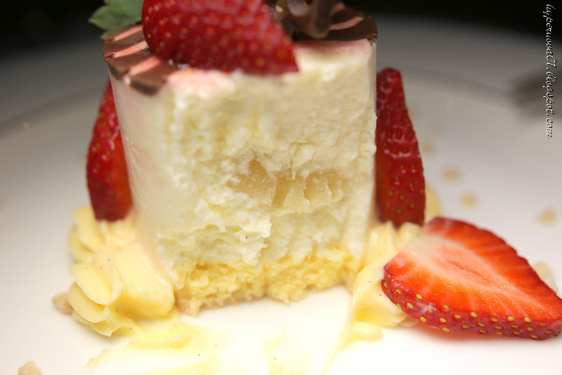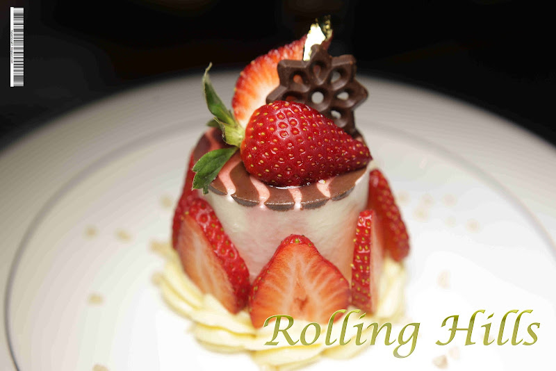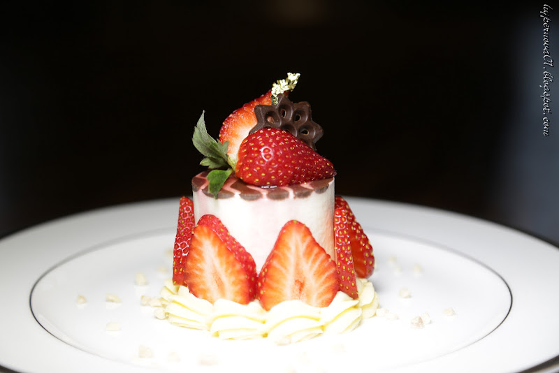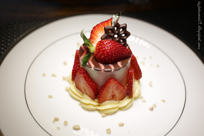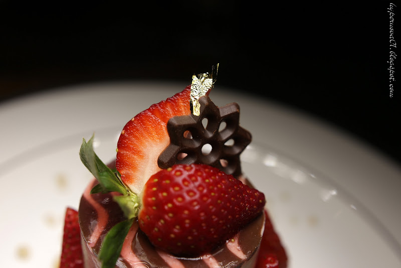 上層巧克力、草莓的酸苦味道延續了雪酪了芬芳與淡淡的甜味