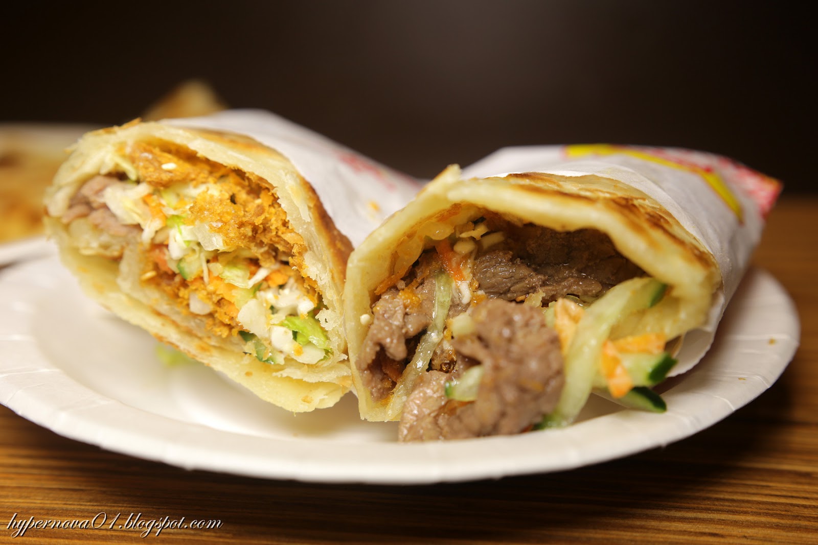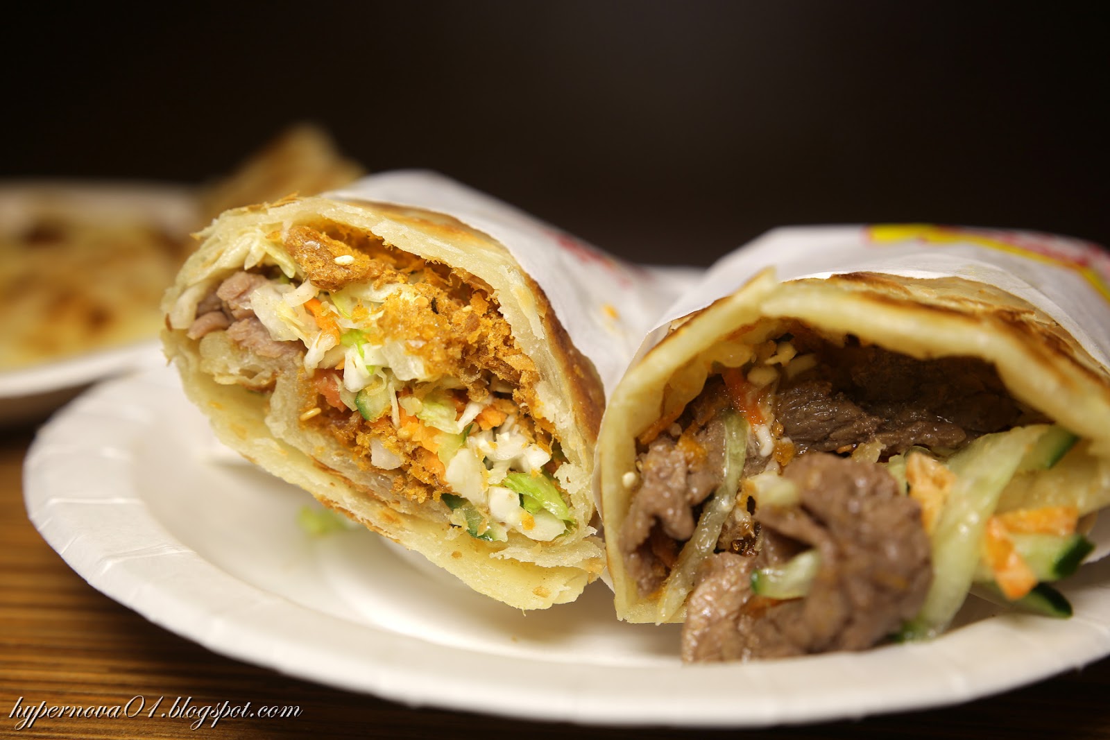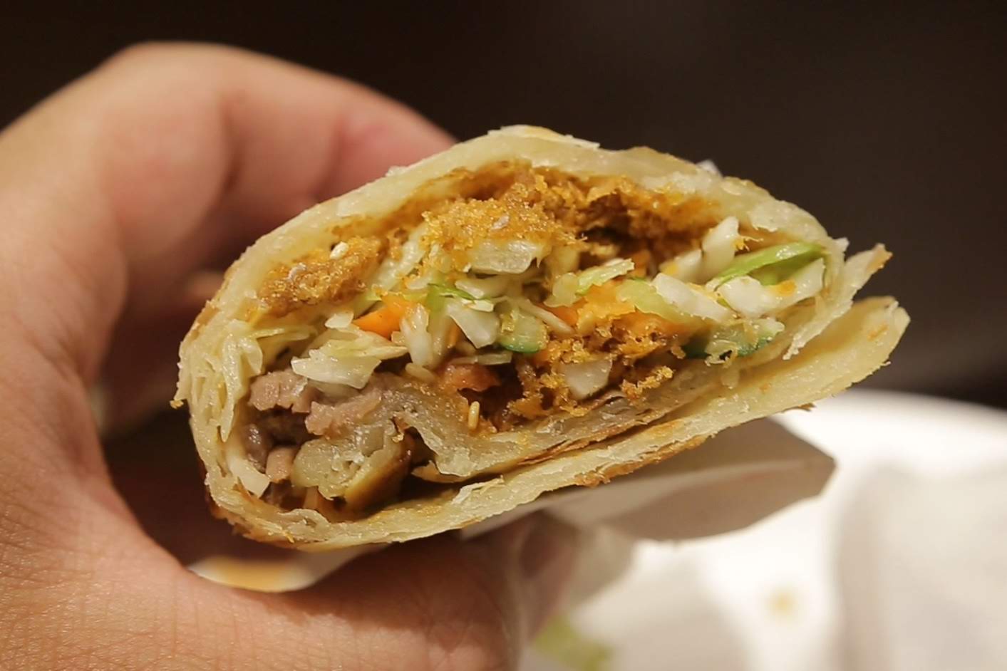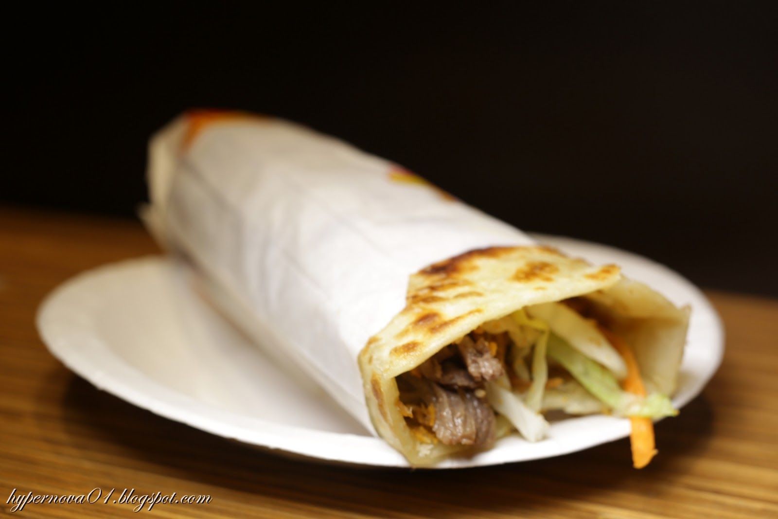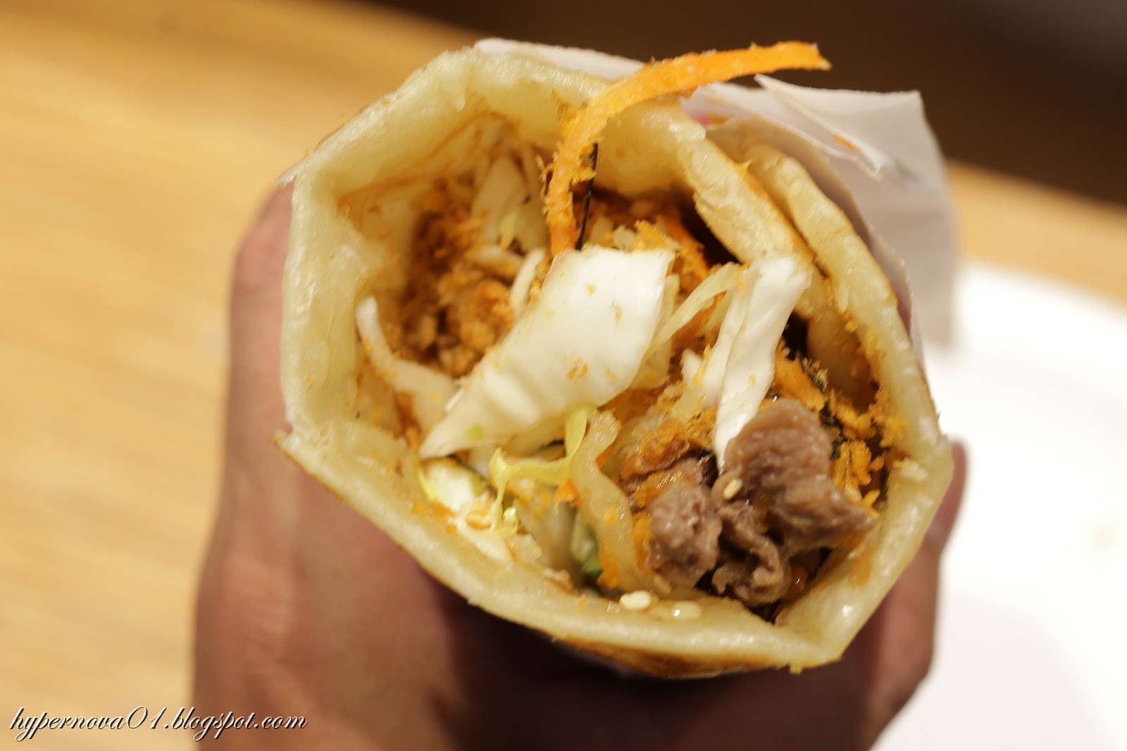 牛肉塞得滿滿的同時有醬汁的味道,不需要沾醬就可以吃到捲餅的甜味