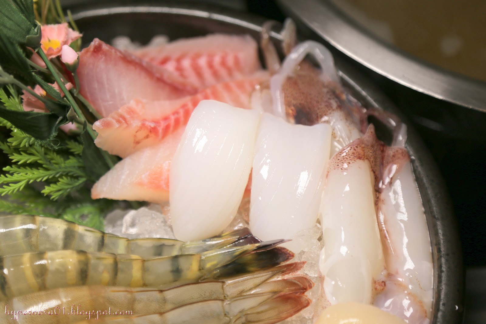 紋甲花枝、生食干貝、潮鯛、小卷、草蝦、白蝦組成的海鮮拼盤