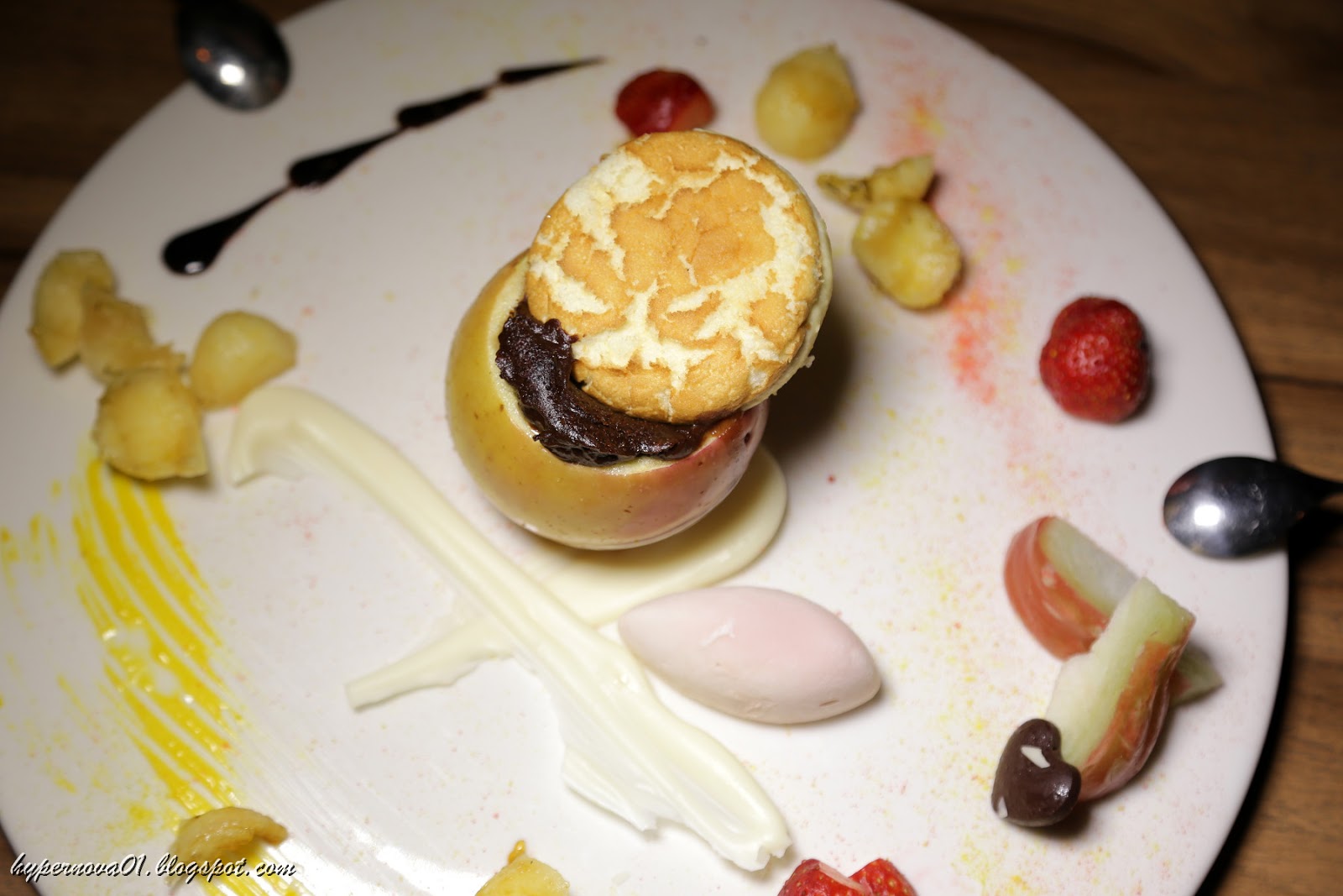以蘋果為中心裝承著熱巧克力泥覆蓋一片蛋糕