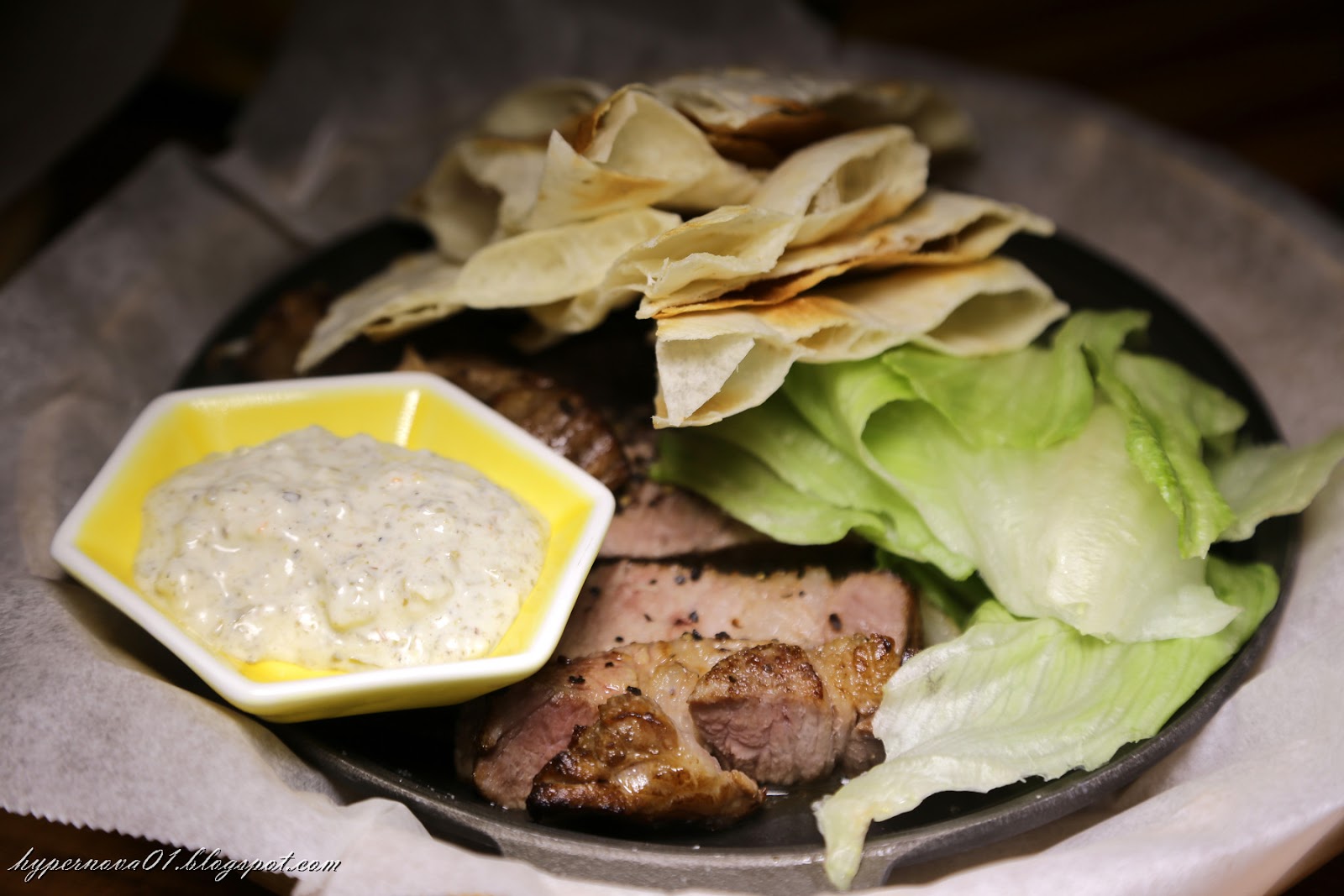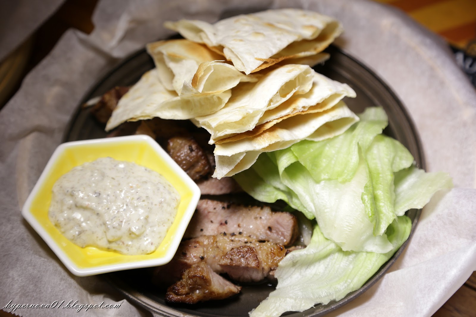 以蘋果酒、香料醃製一整晚的豬排搭配美生菜、烤餅完全是聚餐吃拼盤的組合阿