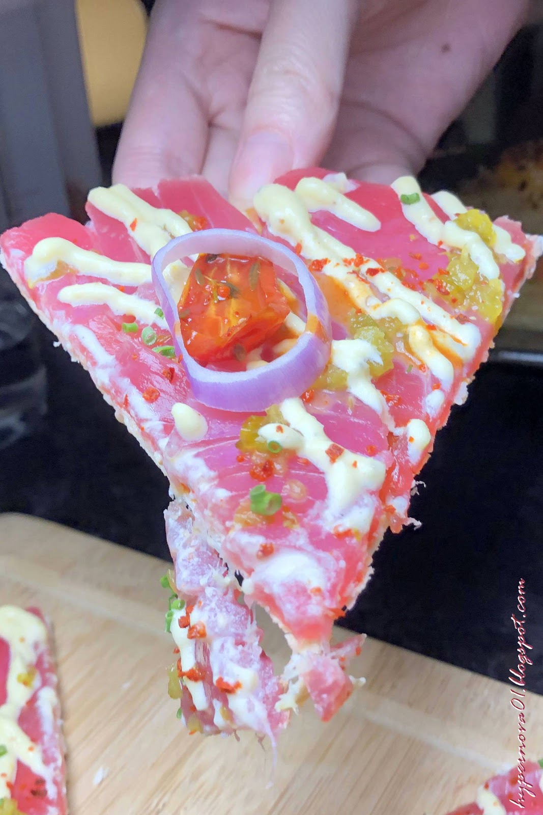 生鮪魚片加上辣醬、乾番茄、洋蔥、芥末等香料組成的薄餅