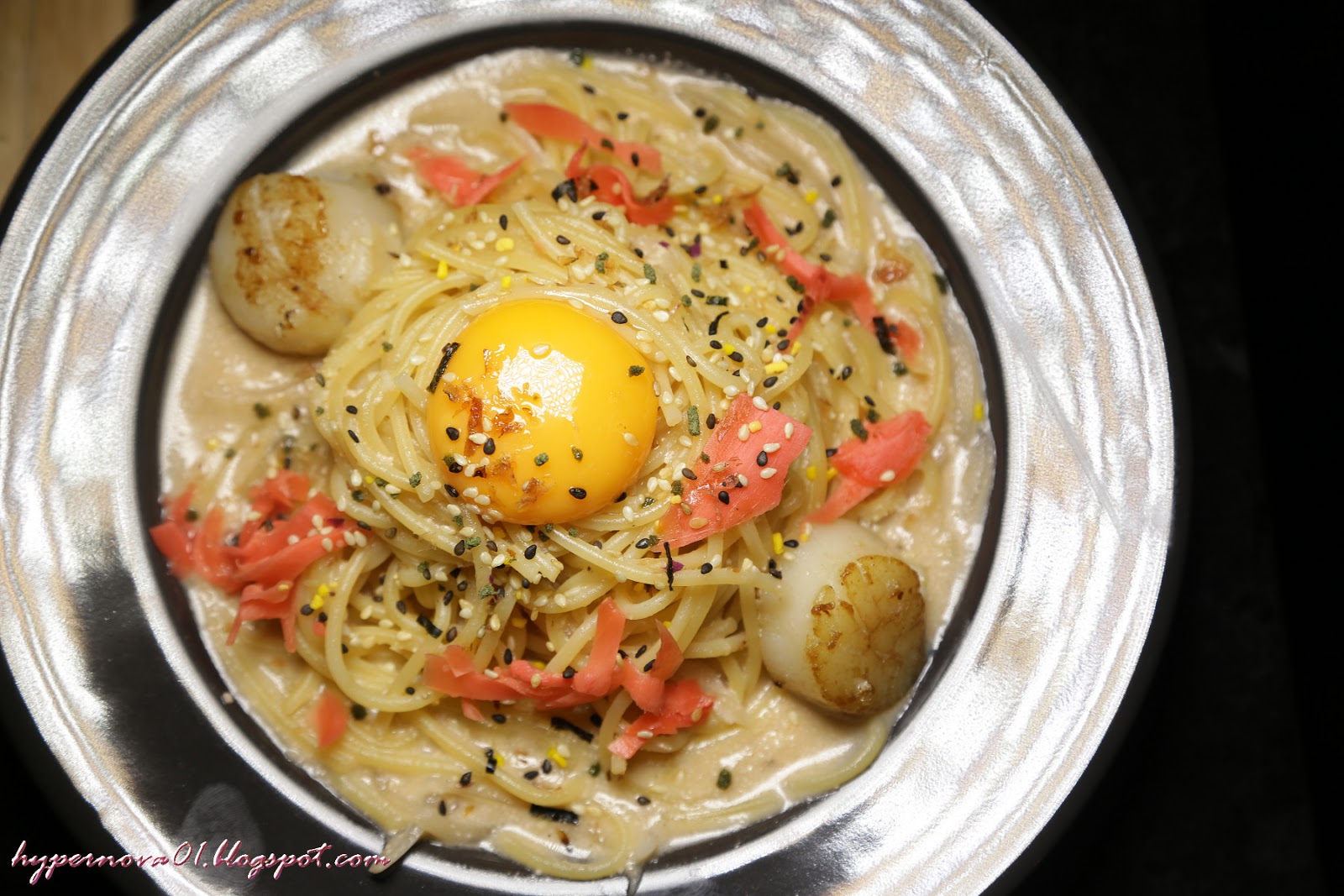 干貝、嫩薑、明太子、蛋黃、芝麻、芥末等融入一整盤麵中