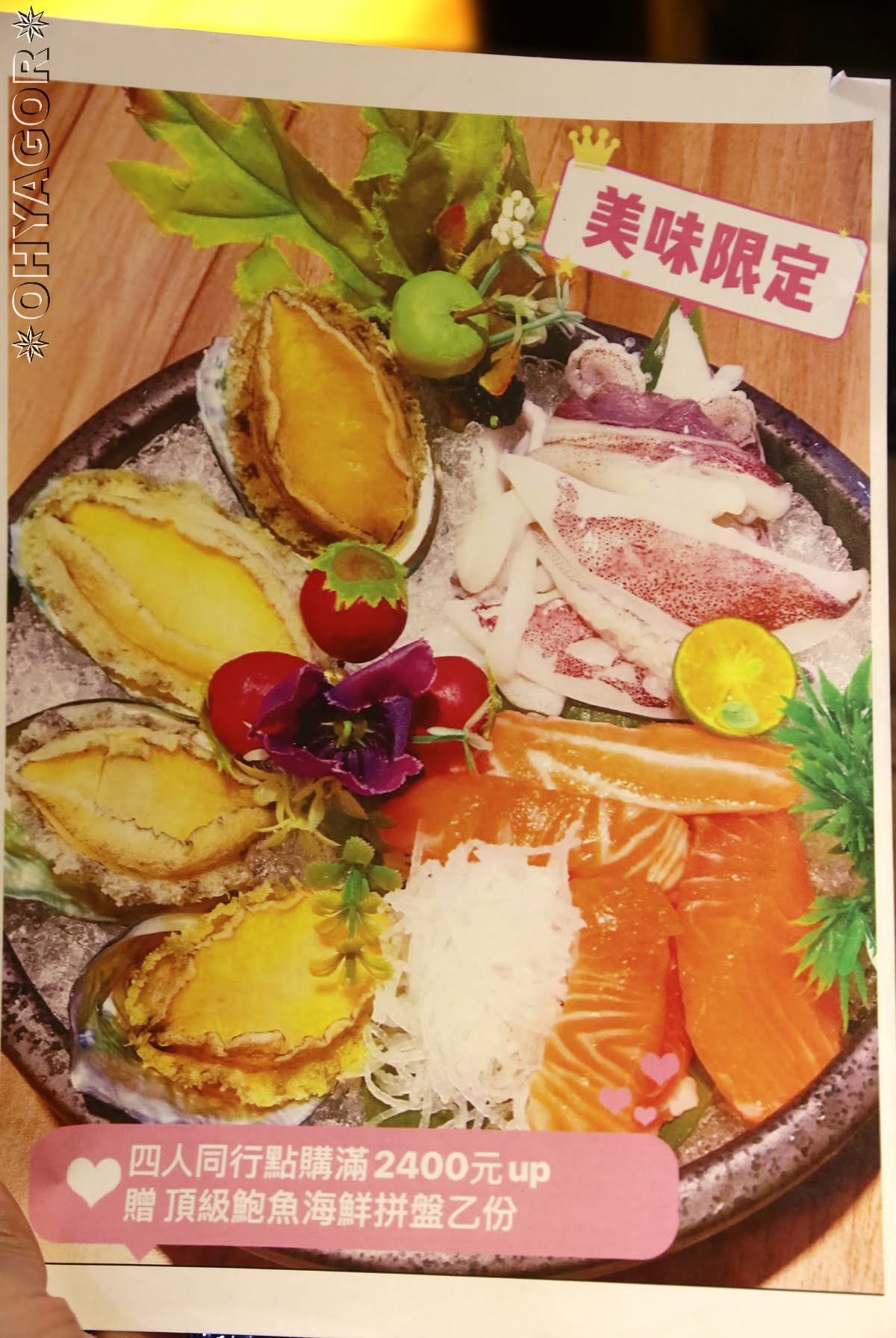 四人滿2400就送鮑魚、鮭魚刺身、中卷海鮮大拼盤