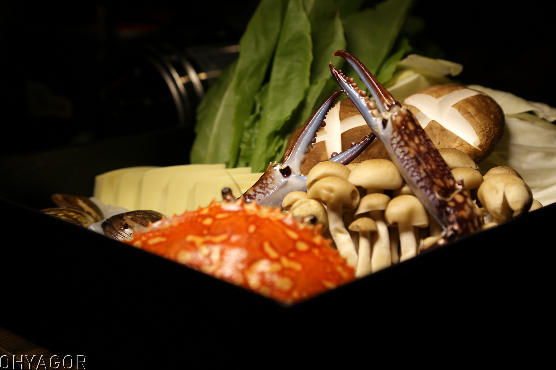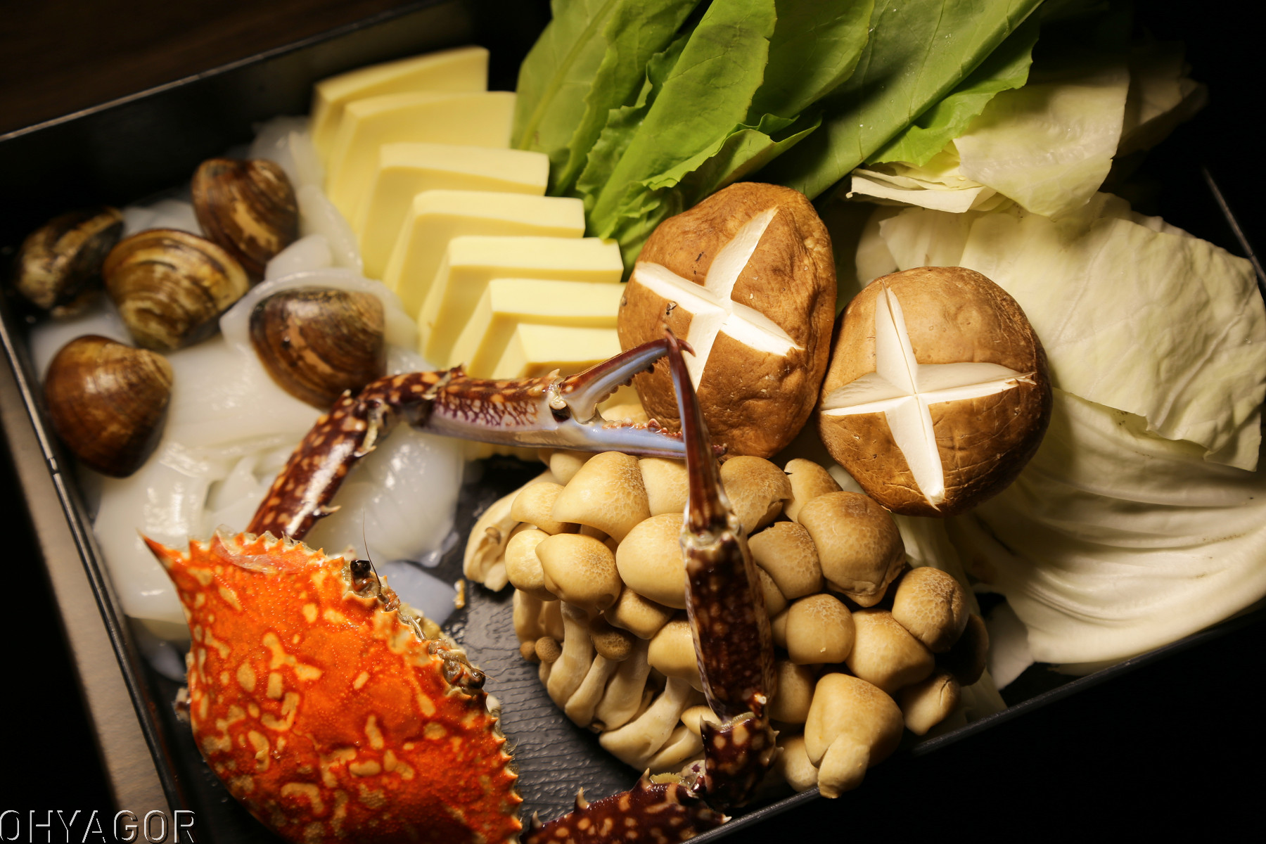 花蟹、蛤蠣、軟絲、菇類、雞蛋豆腐、高麗菜等組合出溫馨的湯品