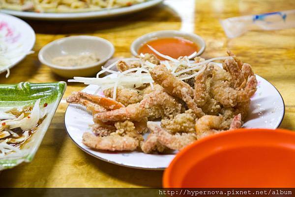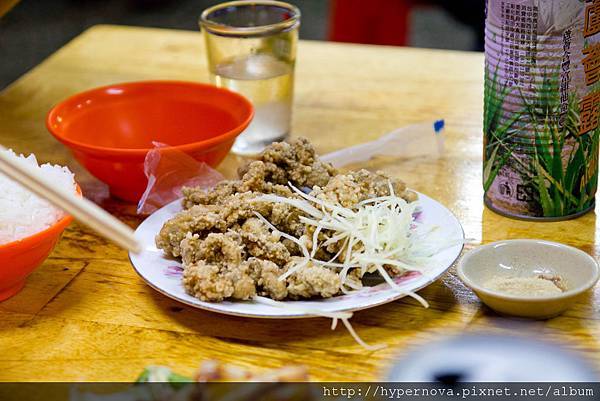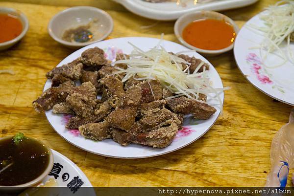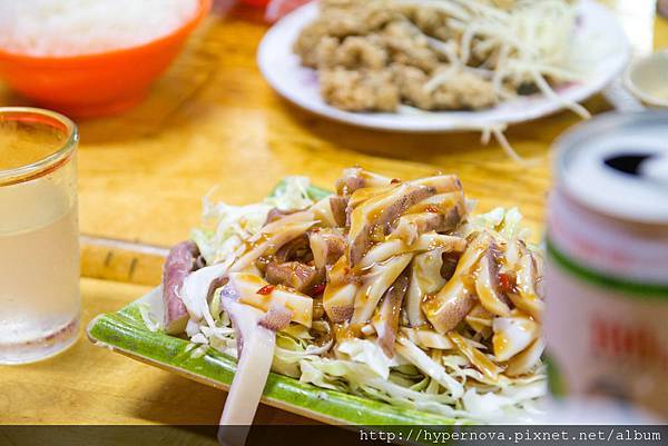 這是一道非常獨特的料理,但是老闆娘沒想到調味料的問題豬肝有一股相當重的鐵鏽味道,是需要很重的調味料壓過味道雖然有嫩薑壓味但是無法阻擋因由炸過的顯著血味。很有創意但是卻失敗了,很多人只敢潛嘗但不能整盤嗑掉,而油炸魷魚還不錯,但是同樣的無法突顯特色,是非常可惜的創意料理。但整體來說這家店非常的平價有當地的台式熱炒風格,有機會可以招兵買馬大口吃遍大基隆壓!