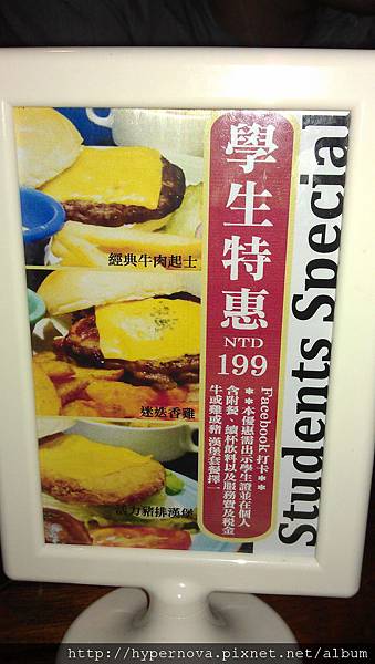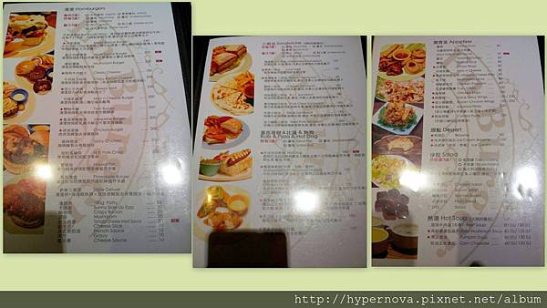 menu上頭沒有太多的個人風格,算是制式的菜單格式。有拼盤、主菜(漢堡、披薩、等...)、飲料(可以續杯須要多加NT50)、甜點