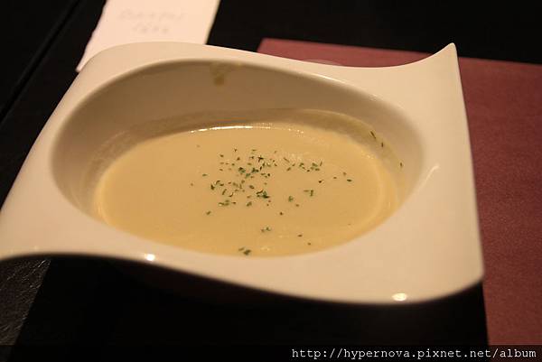 前菜是主廚的湯品,喝起來有點像是牛奶、南瓜、蘑菇的混合濃湯,湯頭非常綿密好喝。