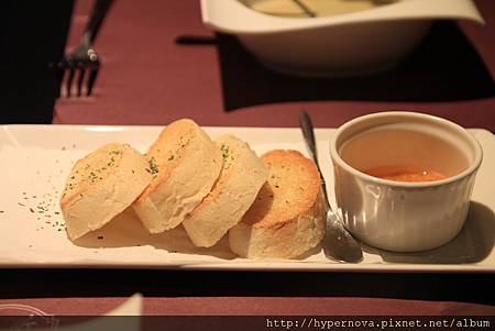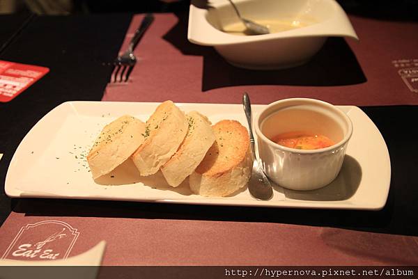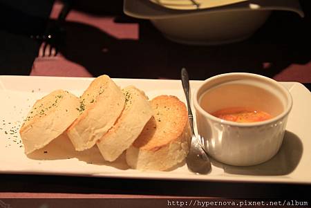 法式麵包,沾醬可能有有番茄、橄欖油、醋(可能是果醋)、鹽、糖做簡單的調配組合讓麵包吃起來富有水果特有酸跟香氣。