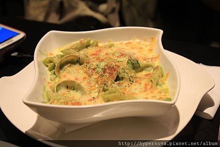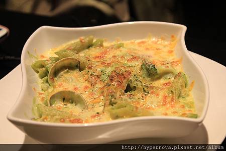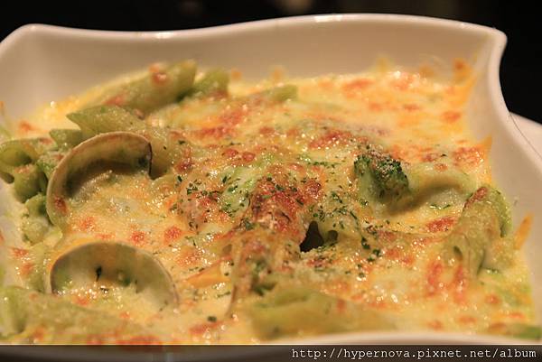 這是朋友點的焗烤青醬海鮮筆尖麵NT280。份量比燉飯大上很多,其實對男生食量較大的比較適合,筆尖麵看起來像是通心粉是比較細的,麵綠色的應該是波菜汁吧,焗烤的香氣很迷人,起司的千絲可以用湯匙拉的很長唷!海鮮似乎跟海鮮燉飯內容物很像,但份量看起來比較大(因為:通心粉中空體積大阿)整體來說水準也夠,是幸福的美味!!!