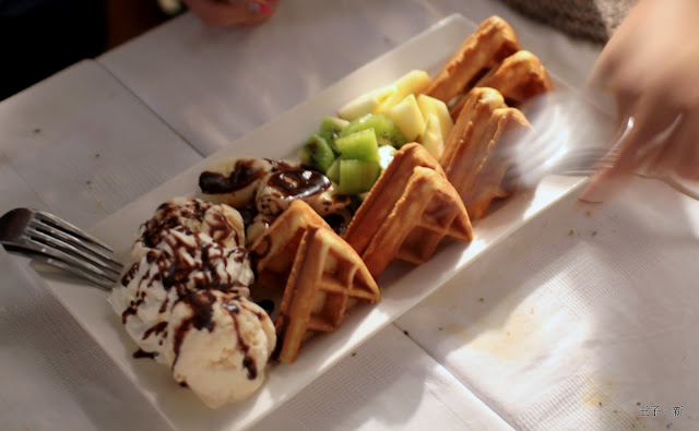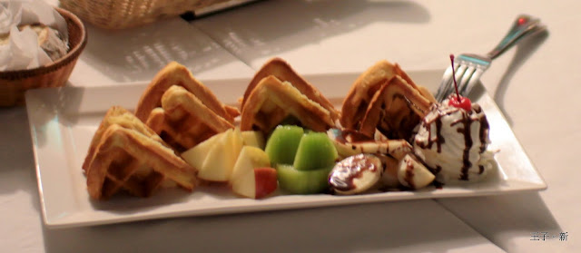 鬆餅上桌,奶油、香蕉、奇異果、蘋果。沾著巧克力醬吃下真是甜美的好滋味,讓我想起初戀的美好!好想唱首情歌隨風起舞,喂!!這裡是山上不是給你撒野的阿!!