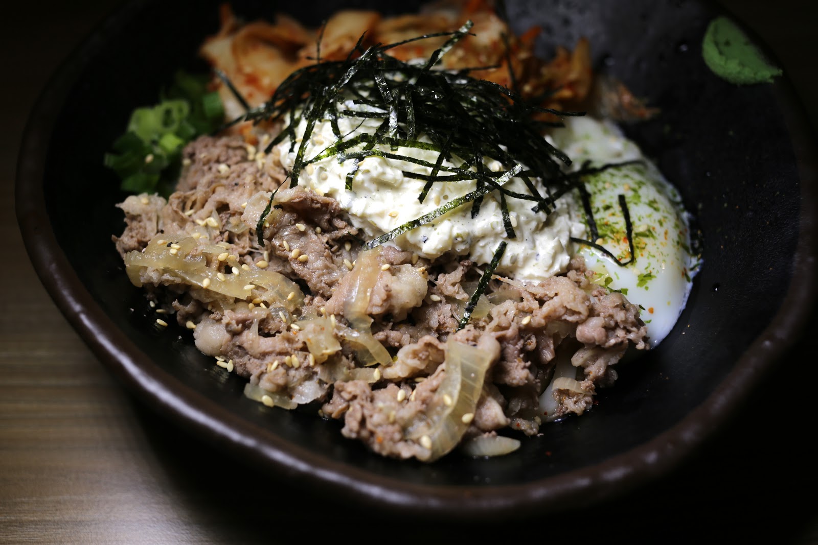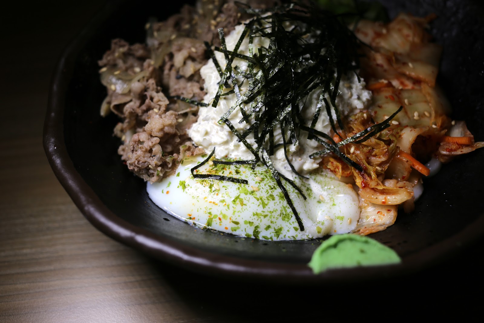 以泡菜、牛肉、蔥花、半熟蛋、芥末加上烏龍麵組成