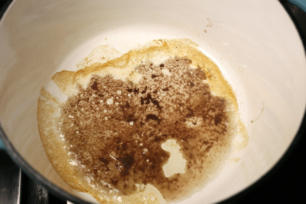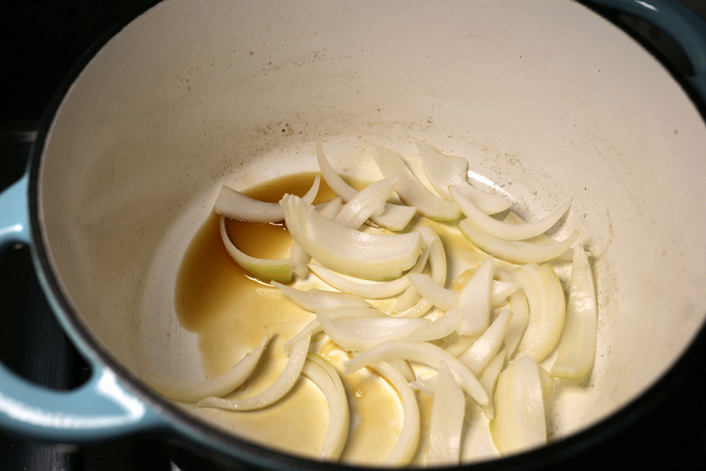 放入生洋蔥,將牛肉湯汁與沙拉油一起拌炒